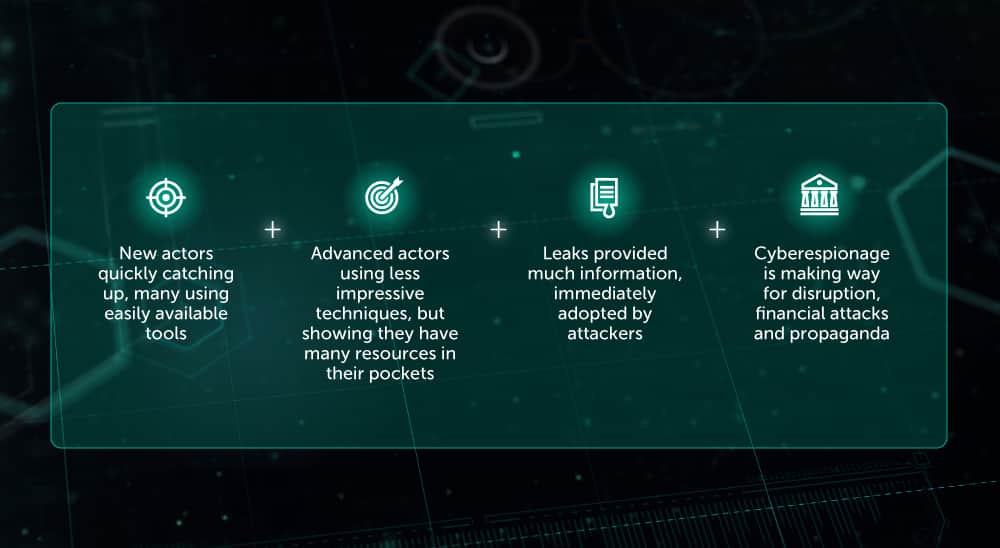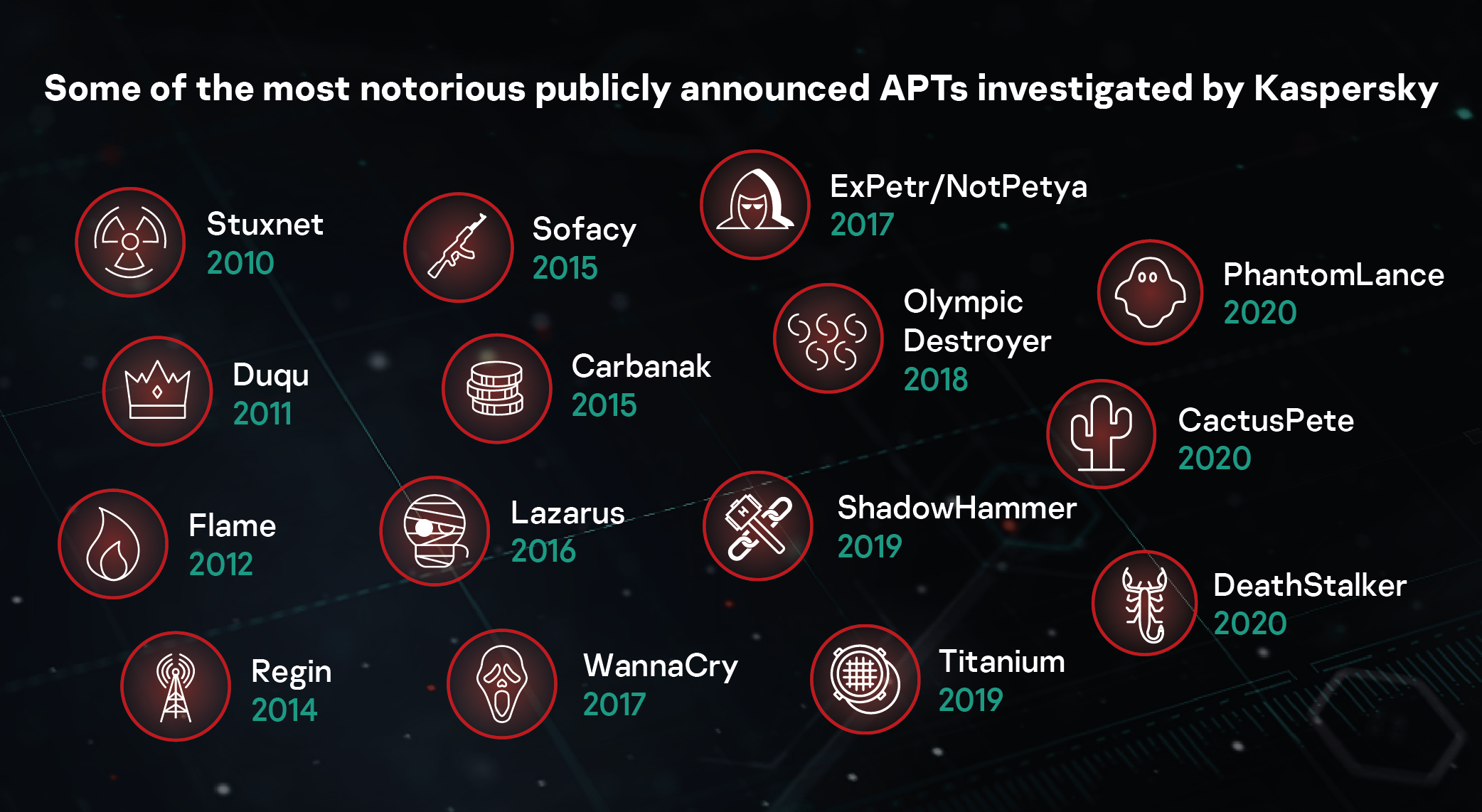 Het GReAT-team van Kaspersky Lab volgt inmiddels meer dan honderd aanvallers en spoort zo de meest geraffineerde en gevaarlijke doelgerichte aanvallen, cyberspionagecampagnes, omvangrijke malware, ransomware en ondergrondse trends in de cybercriminaliteit op in 85 landen