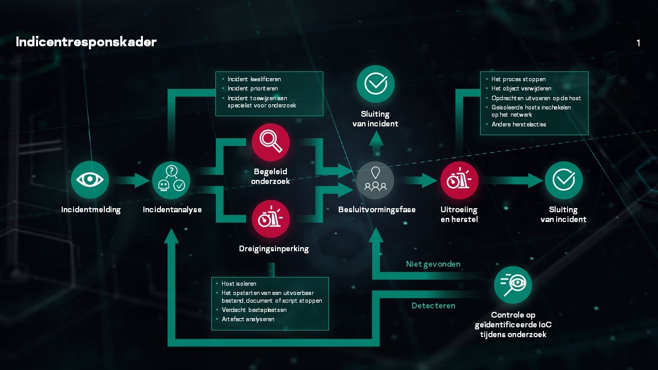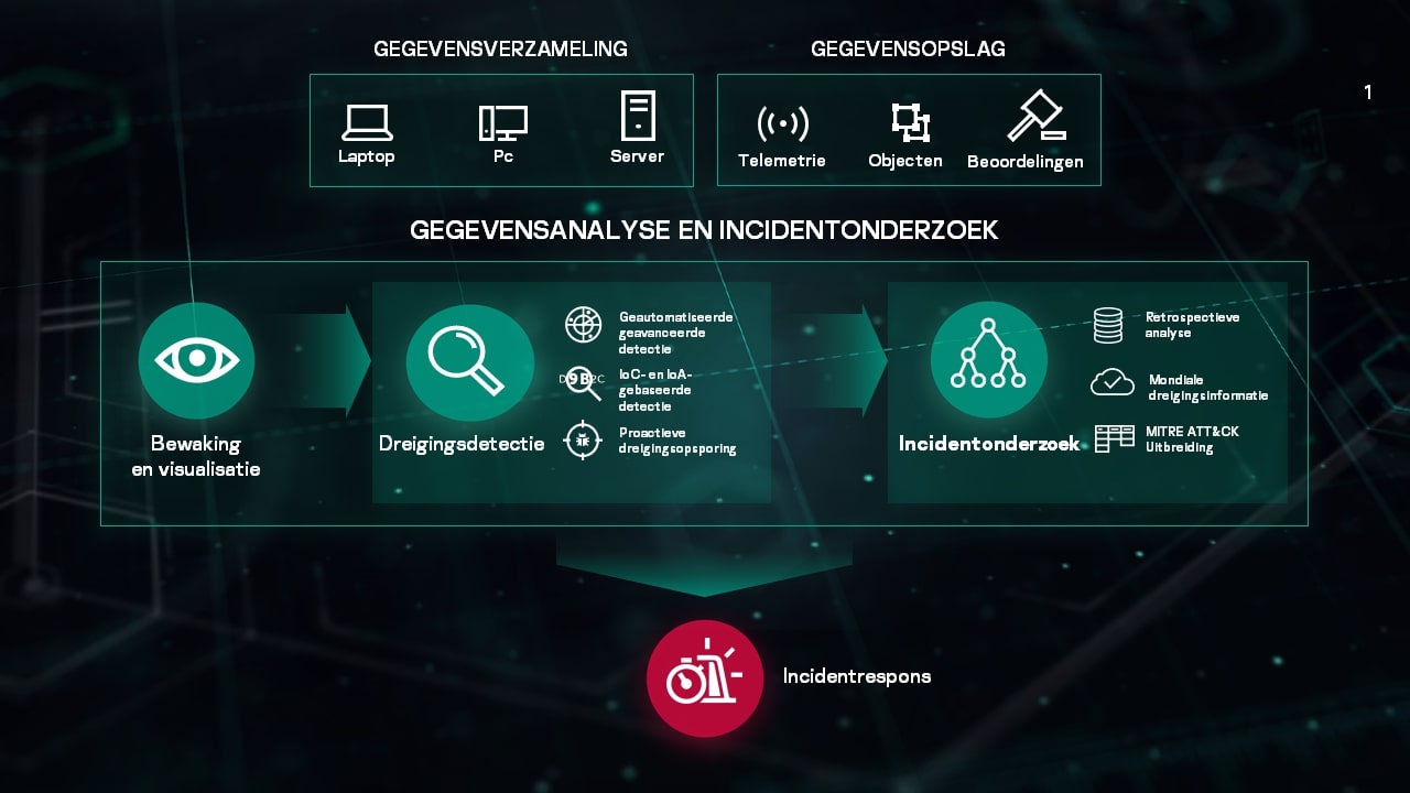 Eén agent voor preventie, onderzoek, opsporing en reactie, zorgt voor een lagere TCO, vereenvoudigt het afhandelen van incidenten en minimaliseert onderhoudskosten. Kaspersky EDR is een module die kan worden geactiveerd in onze toonaangevende Kaspersky Endpoint Security for Business. De module ontdekt en onderzoekt geavanceerde dreigingen en reageert op complexe incidenten. Bovendien is Kaspersky EDR snel en eenvoudig te implementeren.