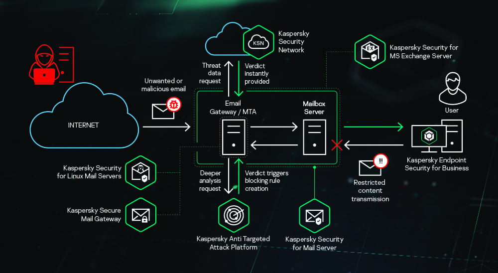 Kaspersky Security for Mail Server beschermt e-mails in de laatste versies van belangrijke e-mailplatforms, waaronder servers die zijn gebaseerd op Microsoft Exchange en Linux.