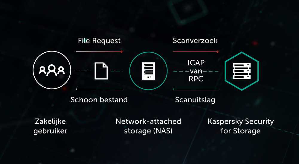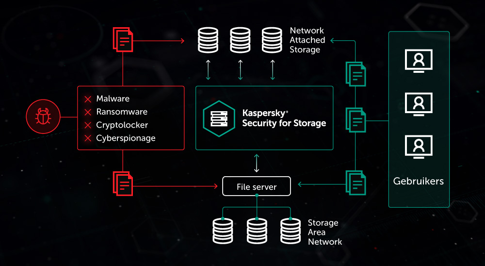 Kaspersky Security for Storage biedt robuuste, krachtige en schaalbare bescherming voor waardevolle en vertrouwelijke gegevens die zijn opgeslagen op storage die aan het bedrijfsnetwerk is gekoppeld en op file servers.